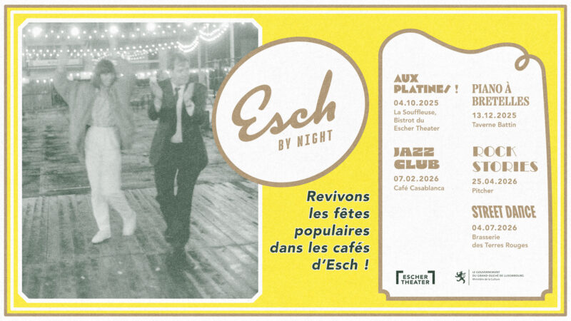 « Métropole du fer », Esch-sur-Alzette a longtemps été réputée pour ses cafés animés. On y venait de tout le pays et au-delà des frontières pour faire la fête. Esch by Night vous plonge dans l’effervescence sociale et musicale de cet âge d’or. Dans les cafés eschois, 6 soirées reviennent à ces moments de joie intense, de l’accordéon au bal électronique, en passant par le swing, le rock et le hip-hop. Des rencontres avec des artistes locaux ainsi que des ateliers pratiques font aussi partie du programme.